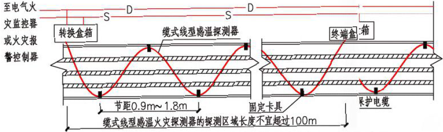 隧道內(nèi)應(yīng)沿電纜設(shè)置線型感溫火災(zāi)探測(cè)器,且在電纜接頭端子等發(fā)熱部位應(yīng)保證有效度;隧道內(nèi)設(shè)置的線型感溫火災(zāi)探測(cè)器可接入電氣火災(zāi)監(jiān)控系統(tǒng)。無(wú)外部火源進(jìn)入的電纜隧道應(yīng)在電纜層上表面設(shè)置線型感溫火災(zāi)探測(cè)器;有源入可能的電纜隧道在電纜層上表面和隧道頂部,均應(yīng)設(shè)置線型感溫火災(zāi)探測(cè)器。線型感溫火災(zāi)探測(cè)器采用“S”形布置或有外部火源進(jìn)入可能的電纜隧道內(nèi),能響應(yīng)火焰規(guī)模不大于100mm 的線型感溫火災(zāi)探測(cè)器。如圖3所示: