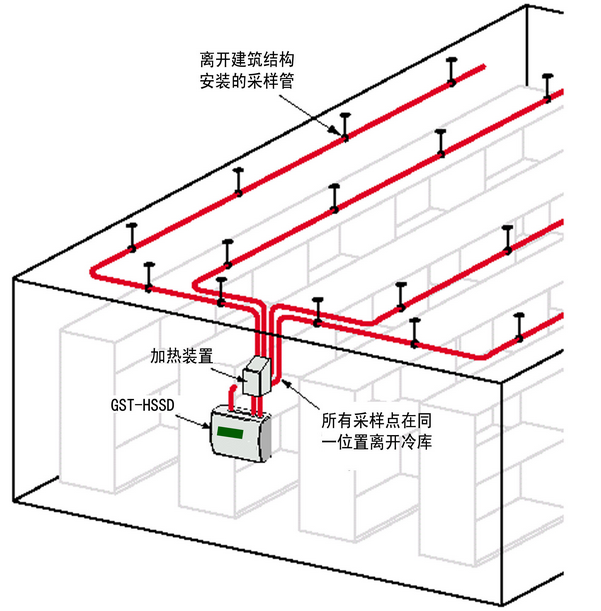 冷庫中采樣管,加熱箱和吸氣式感煙火災(zāi)探測器的相對位置