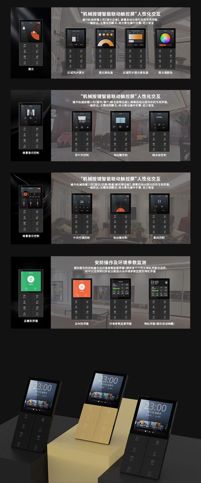 - 屏幕二級界面:操作機械按鍵上的【調(diào)光/窗簾/音樂/空調(diào)/地暖/新風(fēng)/安防/環(huán)境等】對象,屏幕自動出現(xiàn)對應(yīng)的專用界面,一觸即達,無需來回翻頁,極大簡化操作步驟,老少皆宜,業(yè)界首創(chuàng)